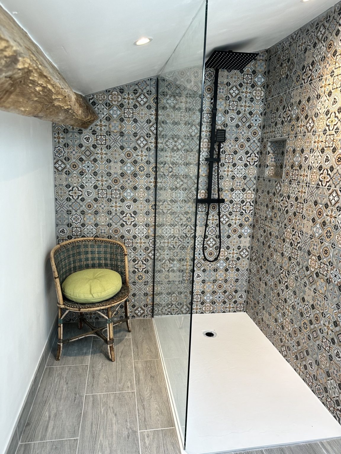 The en-suite has a large rain-style shower and a smaller shower head with a flexible hose, a washbasin and a separate wc.