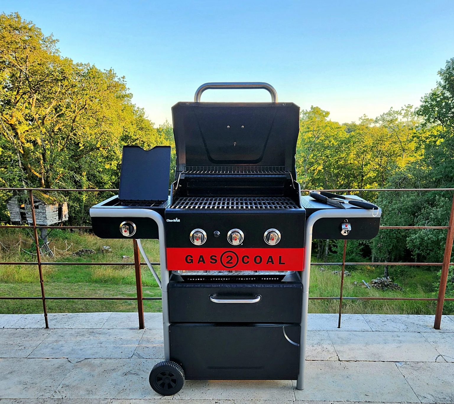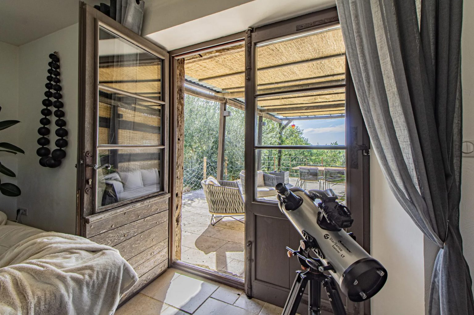 From La Prairie, double doors open to an elevated terrace with breathtaking views over the pool, the valley, and the forest below. The space features a comfortable seating area. There is also a shaded dining spot beneath a lovely olive tree. These elements create a tranquil ambience. A large barbecue is available for alfresco cooking. Gas, charcoal, and all the necessary accessories are provided.