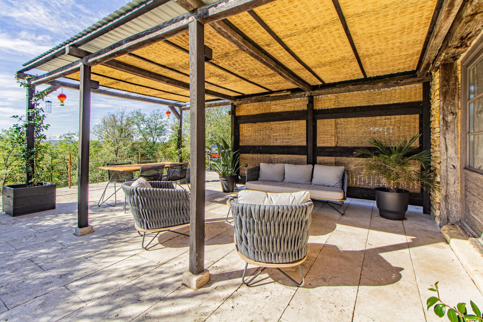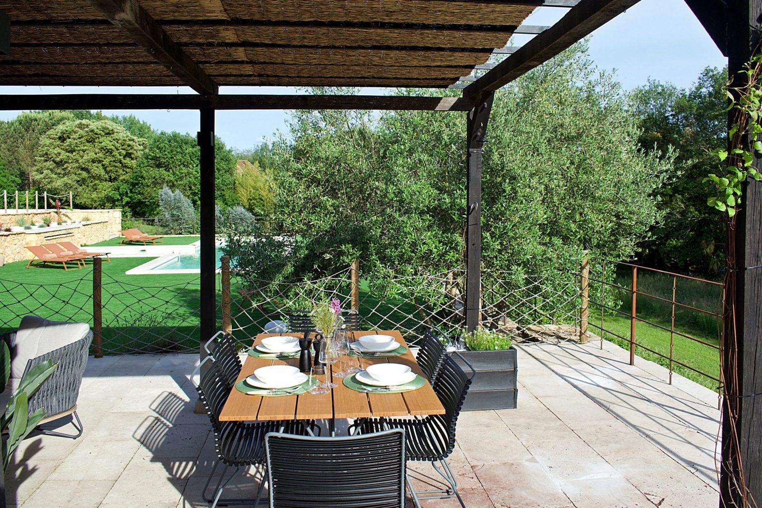 From Le Vallon, step through the glass door onto an elevated terrace. You will enjoy stunning views over the sparkling pool. Lush private woodland and a rolling valley lie below. Shaded and tranquil, it offers ample seating and a spacious dining area. There is a large table perfect for breakfast or sunset dinners.