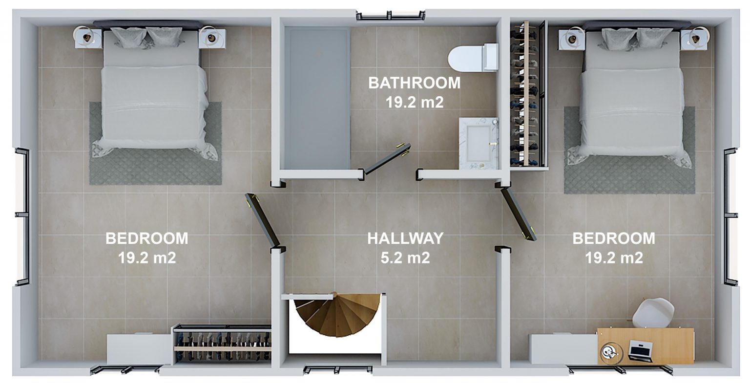 Both double bedrooms are located on the upper floor. You can access them via a charming spiral staircase from the living and kitchen area. Each bedroom is designed with comfort and relaxation in mind. They feature luxurious double beds dressed in high-quality white bed linen. Soft duvets and comfortable pillows are included. Plush cotton towels are provided for an added indulgence. There are blackout blinds and shutters on all the top-floor windows, ensuring a restful night’s sleep.