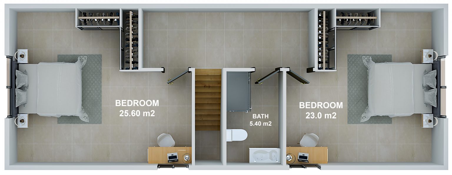 Bathroom: Shared with and situated between bedrooms 2 and 3. walk-in shower, wc, and wash basin.