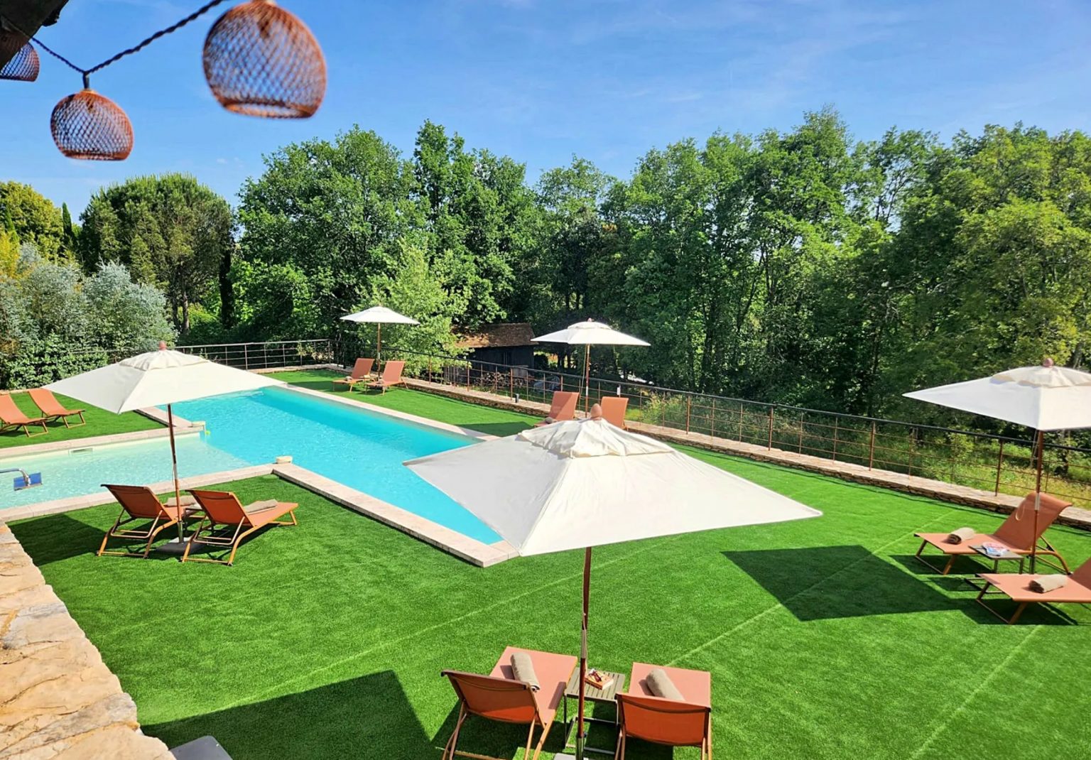 From Le Vallon, step through the glass door onto an elevated terrace. You will enjoy stunning views over the sparkling pool. Lush private woodland and a rolling valley lie below. Shaded and tranquil, it offers ample seating and a spacious dining area. There is a large table perfect for breakfast or sunset dinners.